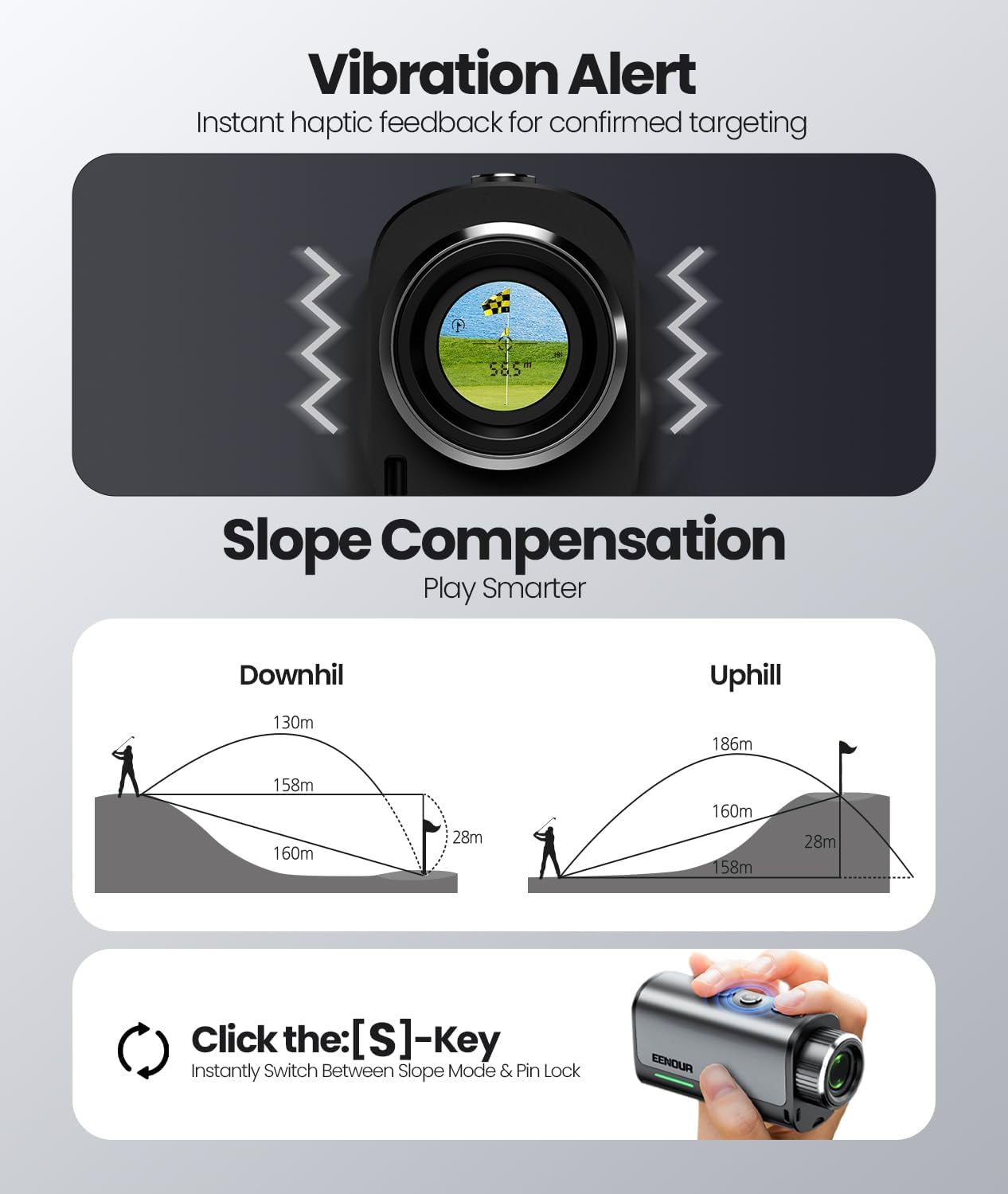 【23MM Ultra Lens + 95% Transmittance + 7X Magnification】 Featuring a 23mm objective lens, premium over-95% light glass, and 7x magnification, this rangefinder delivers ultra-clear view to bring targets up close. It includes a Tournament Mode 【S】 switch—effortlessly toggle flag-lock and slope compensation without complicated operations. Dual side indicator lights let you instantly check slope status, ensuring full tournament compliance.