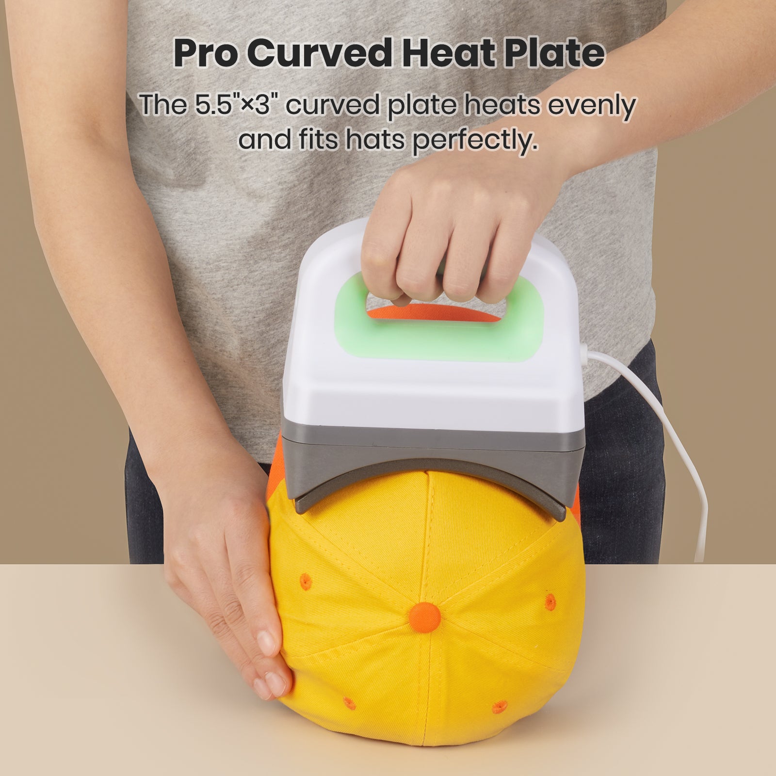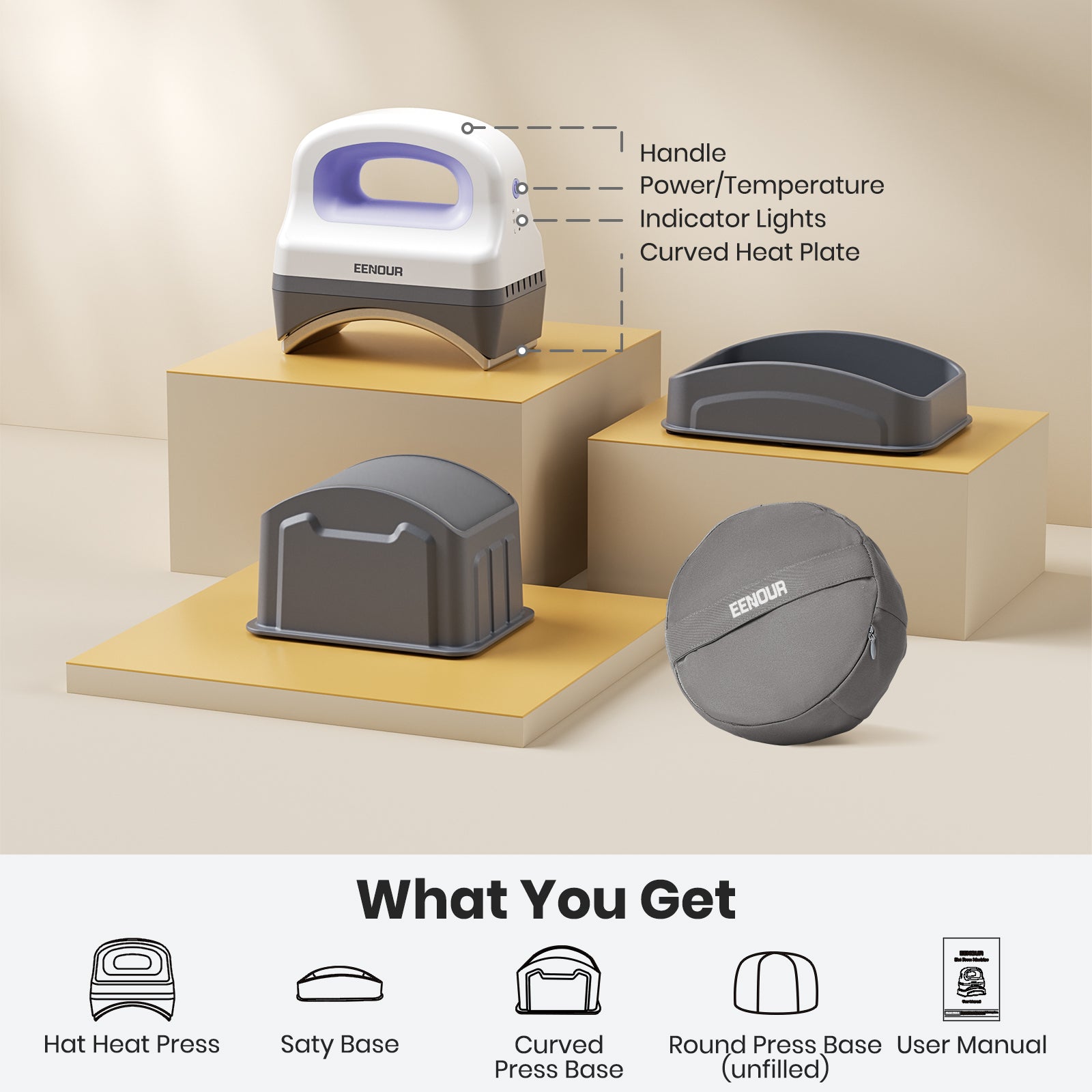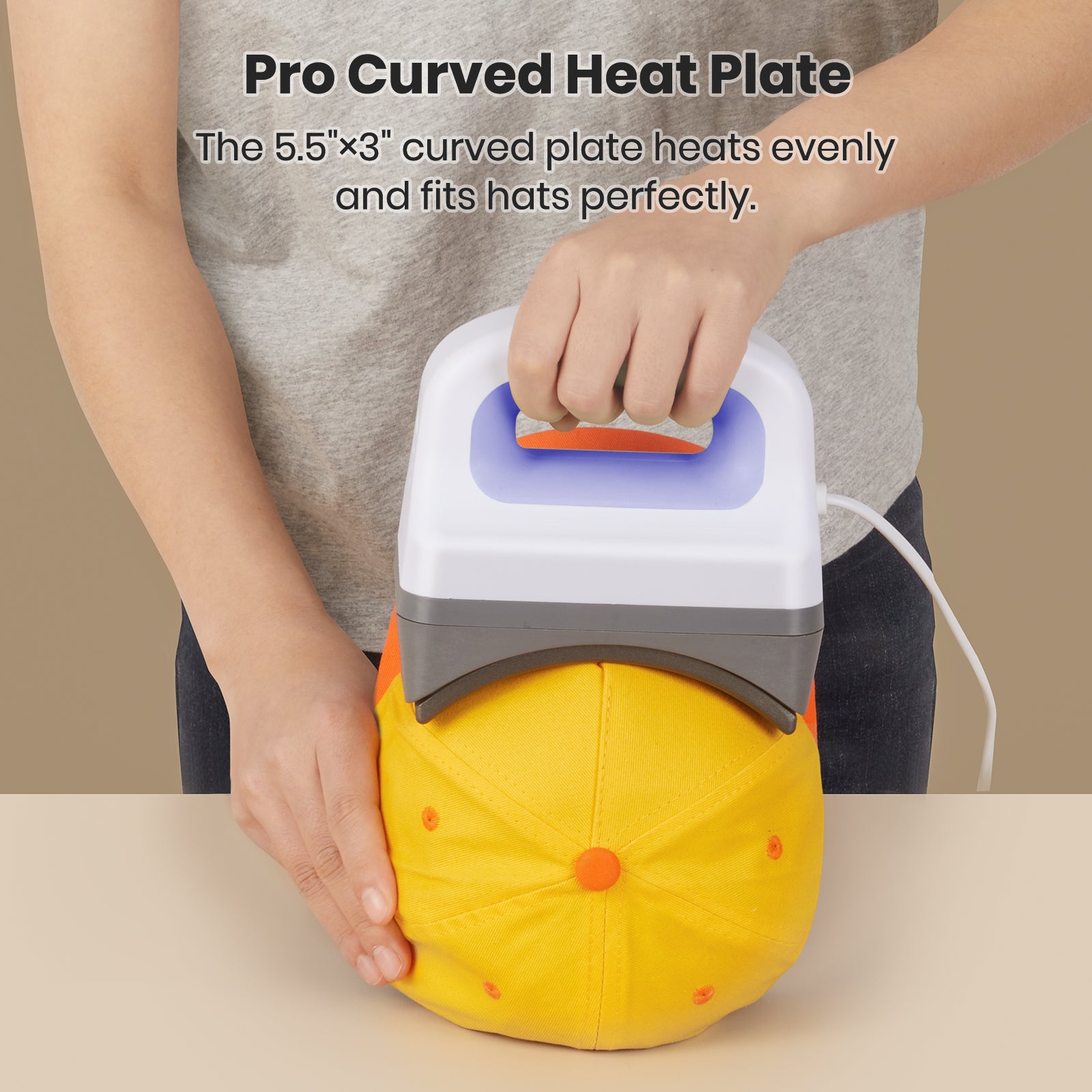 The portable hat press comes with 2 press bases that can fit all types of caps. The curved base is best for baseball caps, trucker hats, golf caps, and more, and the other rounded base (unfilled) is perfect for bucket hats, and beach hats.