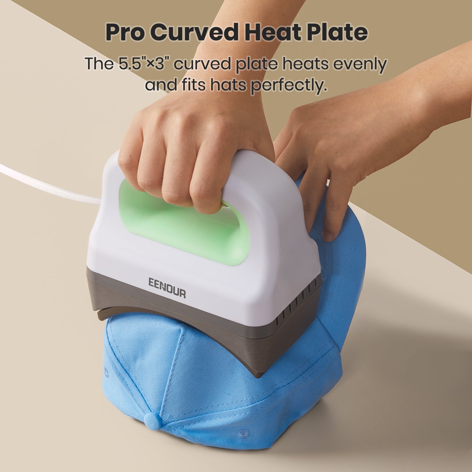 The hat press is with a 5.5″×3.5″ curved ceramic-coated heat plate, which can perfectly fit and have a pro-level heat-transfer result on caps. No pressure is required and no creases are left on caps.